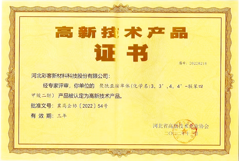 河北彩客新材料科技股份有限公司是一家專注于高性能精細(xì)化工產(chǎn)品研發(fā)、生產(chǎn)及銷售的高新技術(shù)企業(yè),主要產(chǎn)品為高性能有機顏料中間體(DMSS、DATA、DMS、DIPS)、食品添加劑中間體 DMAS、新材料聚合單體 BPDA 等。